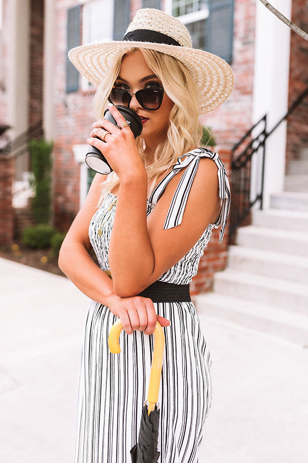 We have no doubt this stunning jumpsuit is just your stripe with its lightweight breezy material, black and white horizontal accent stripes, form fitting bodice with smocked detailing, straight neckline with skinny tie closure shoulder straps, and relaxed pants silhouette that falls into straight floor-length hemlines!