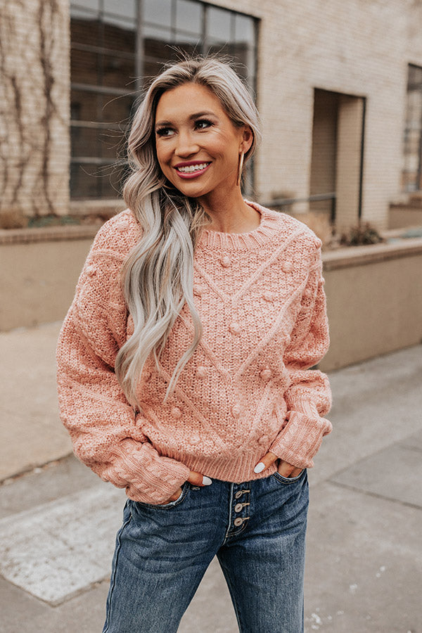 Guaranteed to be your 'Most Loved' sweater of the season! This cozy knit sweater features puffy sleeves with cable knit detailing on the cuffs, a defined neck and hemline, and a raised pom-pom and 'v' pattern on the front of the sweater.