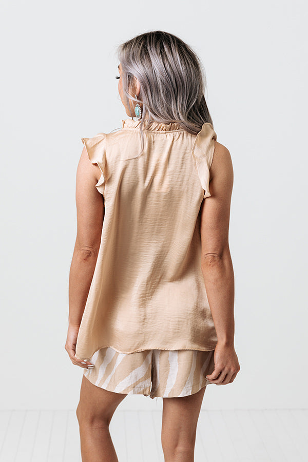 Whether you are headed to work or out with the girls, our beige colored 'Prelude Shift Top' is perfect for all occasions! It features lightweight and flowy silk-like material, a v-cut neckline with a subtle tie closure collar, a sleeveless fit with oversized ruffle trim detailing, and a relaxed silhouette that falls into a straight hemline!