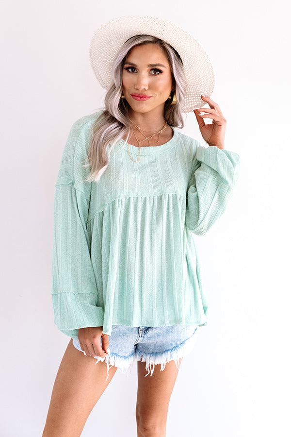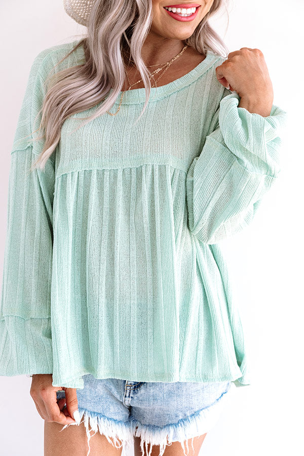Effortlessly achieve a boho look with our adorable mint colored "Slow Song" top featuring lightweight material with subtle horizontal stripe detailing, a high rounded neckline, long oversized bubble sleeves with fitted elastic banded cuffs, a v-cut back with two accent straps, and a relaxed babydoll silhouette that falls into an uneven hemline!