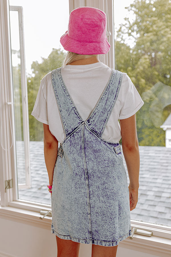 Our casual cute 'Mysti' dress features lightweight acid wash denim material, a zip closure front, wide sleeveless shoulder straps, low accent front pockets, and a structured but flattering silhouette that ends in a straight mid-thigh length hemline!