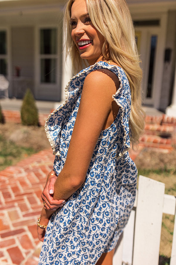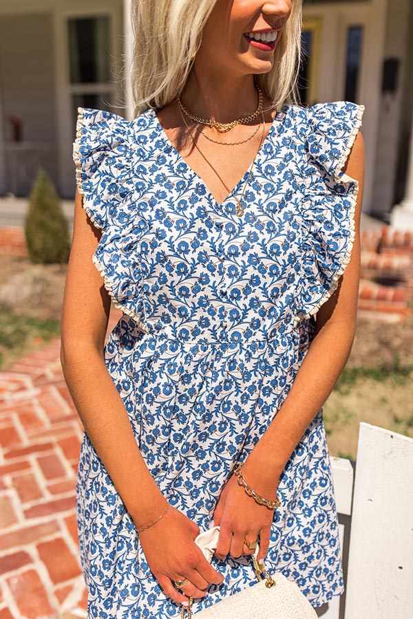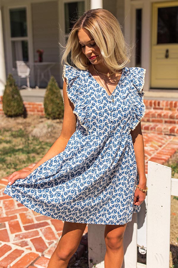 Get ready effortlessly with our charming 'The Sweetest Kiss' dress featuring lightweight material patterned with a blue floral print, a v-cut neckline, ruffled cap sleeves, and a relaxed babydoll silhouette that ends in a straight mid-thigh length hemline! on products