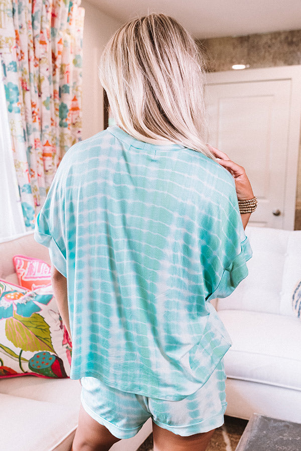 Stay cozy on your "week night in" with this adorable shift tee featuring ultra soft lightweight material patterned with light turquoise colored tie dye, a high rounded neckline, short loose sleeves with rolled cuffs, and a relaxed silhouette that falls into a straight hemline! This comfy piece styles perfectly with our matching "Week Night In Tie Dye Shorts," a scrunchie, and some fuzzy slippers for the ultimate two-piece lounge look!