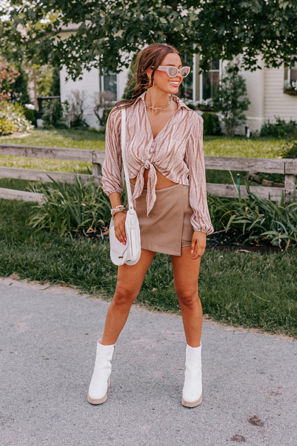 Add a boho flair to any look with our darling natural hued 'City On Speed Dial' top featuring lightweight chiffon material patterned with a subtle oversized zigzag print, a button up front with a collared neckline, long loose sleeves, and a relaxed silhouette that falls into a tied front hemline and a straight back hem!