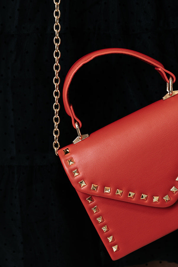 Our chic crimson colored 'Vineyard Bound' purse is sure to be envied with its sleek lightweight material, gold studded detailing, removable chain link shoulder strap, single short handle, envelope closure with a snap button, and spacious square silhouette with an additional inside pocket!