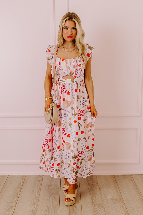 - This sweet dress is perfect for a sunny picnic! - Lightweight material with a colorful abstract fruit and leaf print - A scoop cut neckline - Short flutter sleeves - Pleated detail at the bust - An open back with two tie details - A cut out detail at the under-bust - Back zip closure at the waistline - A flowy yet flattering silhouette that ends in a ruffle maxi length hemline