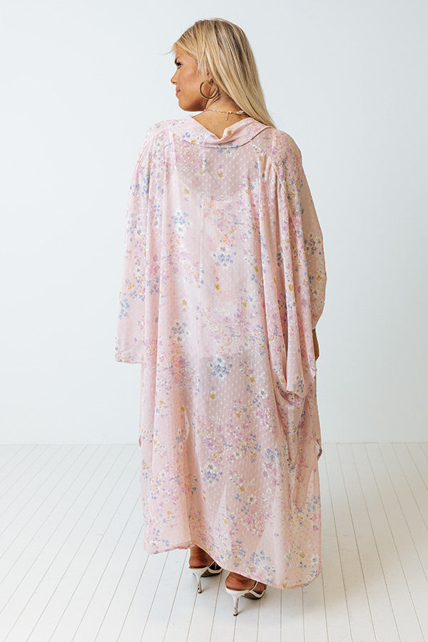 Breeze through summer in style with this fashionable plus size blush overlay featuring lightweight material patterned with a pretty floral print, oversized half sleeves, and a draped open-front silhouette that cascades into a straight mid-calf length hemline with accent side slits!