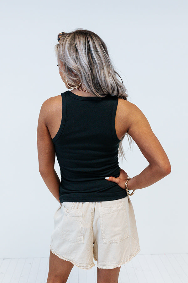Keep your look simple but versatile in our basic black 'Calmer Days' tank featuring lightweight four-way stretch material with subtle vertical ribbed texturing, a rounded neckline, 1-inch sleeveless shoulder straps with a racerback fit, and a flattering figure hugging silhouette that ends a straight hemline! on products