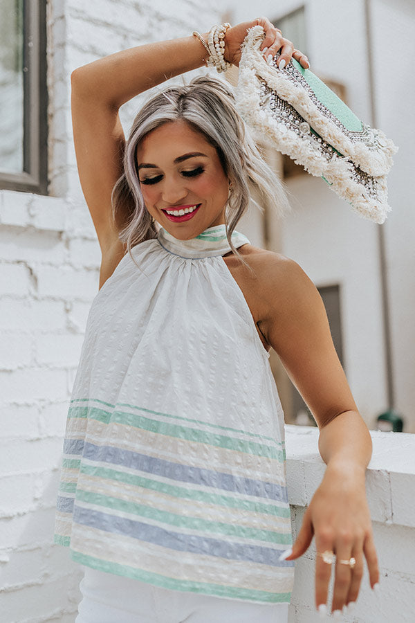 You won't have to await summer long when you treat yourself to this pretty top featuring lightweight flowy material patterned with horizontal blue and green hued accent stripes, a collared neckline with a tie closure in the back, a sleeveless fit, a button down back, and a relaxed silhouette that falls into a straight hemline!