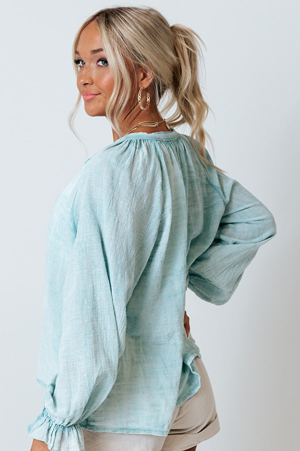 Look chic effortlessly with this classy light turquoise shift top featuring lightweight breezy material with subtle texturing, a button up front with a collared neckline, long bishop sleeves with flared cuffs, and a slouched silhouette that falls into a rounded hemline!