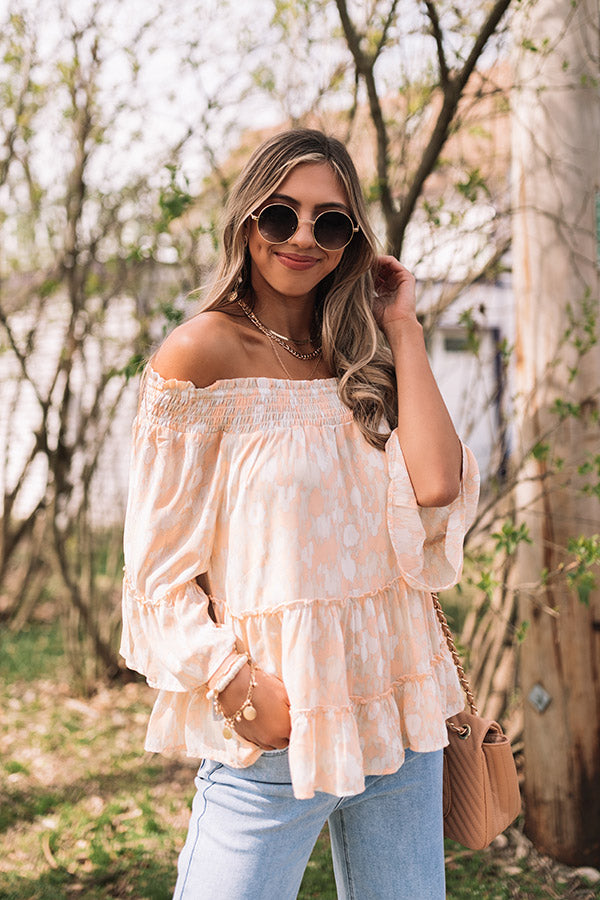 Flirt your way from season to season with this appealing top featuring lightweight flowy material patterned with an abstract light peach and natural hued print, a straight smocked off-shoulder neckline, loose 3/4-length drop sleeves with flared cuffs, and a relaxed silhouette that falls into a peplum bottom with an uneven hemline!