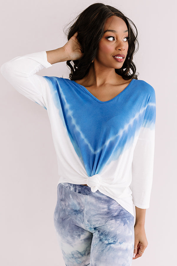 "Hang out" in style with this adorable top featuring soft lightweight material with a tapered blue tie dye pattern, a wide v-cut neckline, loose 3/4-length sleeves, and a relaxed silhouette that falls into a rounded hemline! We have styled this casual cutie with some matching bike shorts and trendy white sneakers, but you can also wear it with some light wash flares, "The Bowen Wedge in Blue," some gold sunnies, and our "City Chic Faux Leather Tote in White!"