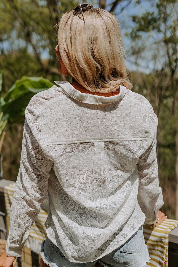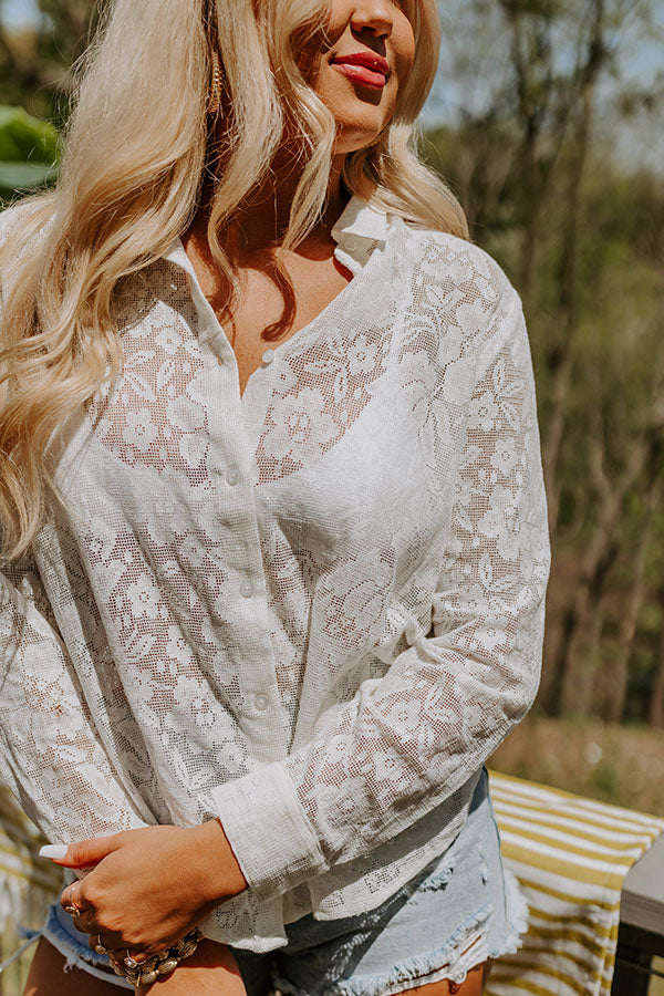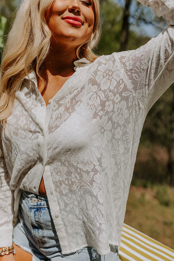 A timeless silhouette with a twist, our classy ivory hued 'Intense Love' top featuring lightweight delicate lace material, a button up front with a collared neckline, long loose sleeves with button closure cuffs, and a relaxed fit that falls into a rounded hemline! on products