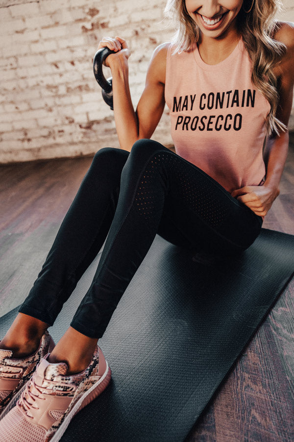Our adorable pink "May Contain Prosecco Shift Tank" features soft lightweight material, a scooped neckline, wide 3-inch shoulder straps, adorable black lettering on the front, a racerback fit, and a relaxed silhouette that falls into a straight hemline! This adorable athleisure piece styles perfectly with a variety of joggers or leggings and trendy sneakers for the ultimate workout look!