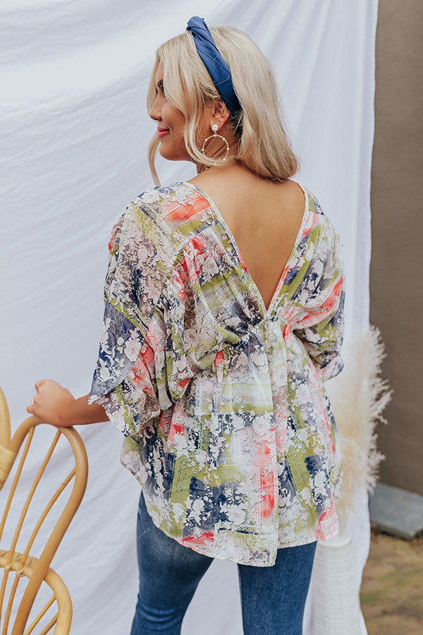 All heads are sure to turn your way when you arrive in our beautiful 'Overlooking Venice Top' featuring lightweight material patterned with an intricate navy, green, and neon pink hued floral print, a v-cut neckline and upper back, oversized bat wing half sleeves, and a slouched silhouette that falls into an uneven hemline!