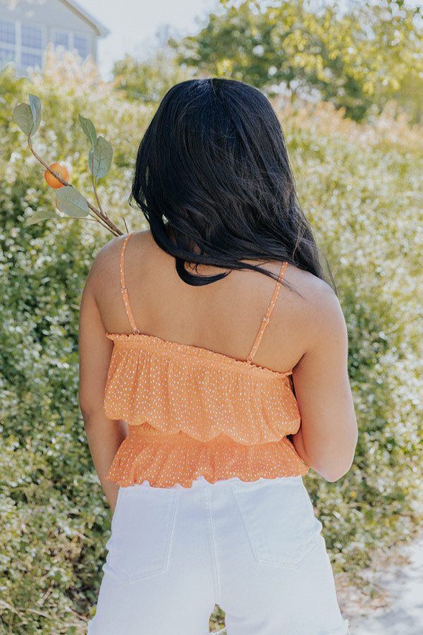 Keep cool all summer long in our darling orange 'Panorama Views Tank' featuring lightweight material patterned with small white polka dots, a straight neckline with adjustable spaghetti straps, and a slouched silhouette that ends in a smocked waistline with oversized ruffle trim!
