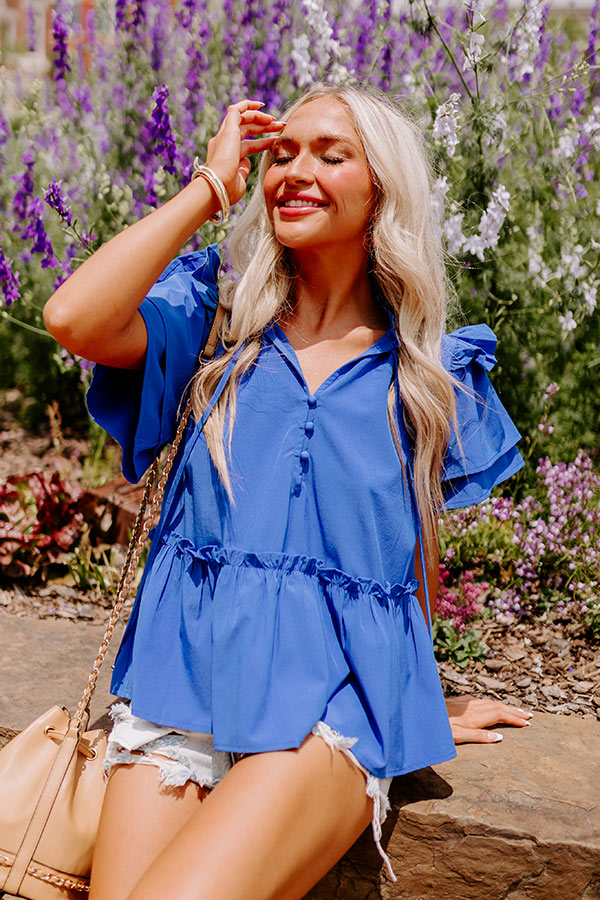 - A v-cut neckline with a tie feature and ruffled accents that goes into a button up bodice