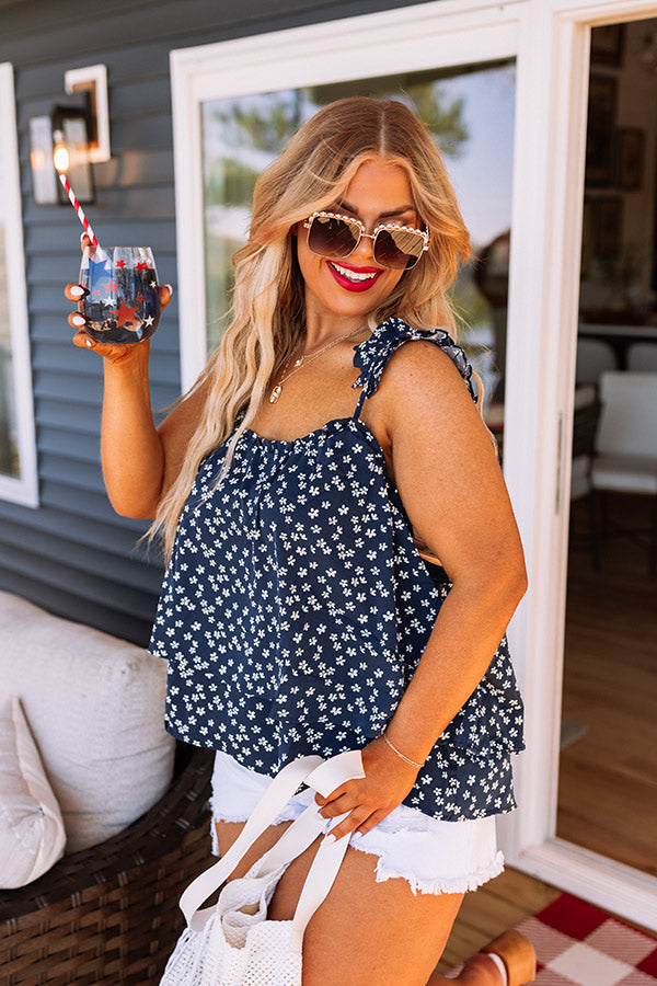 - Lightweight navy colored material with a whit and green hued flower pattern