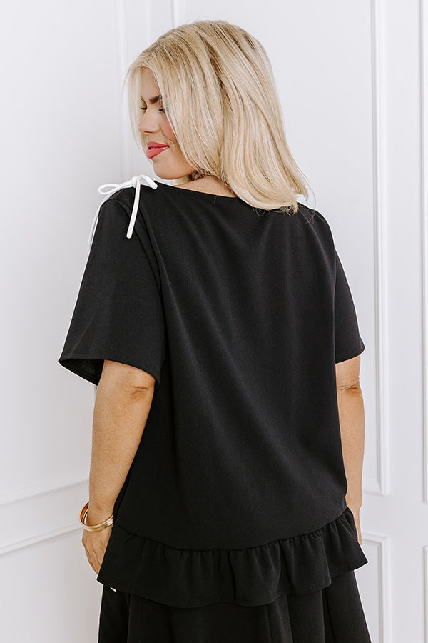 - Elevate your style with this elegant black and white top, featuring charming accent bows and delicate ruffle detailing. The classic color palette is perfectly complemented by the playful touches, making it a versatile piece for both casual and dressy occasions. Whether paired with your favorite jeans or a sleek skirt, this top is sure to add a sophisticated flair to any outfit.