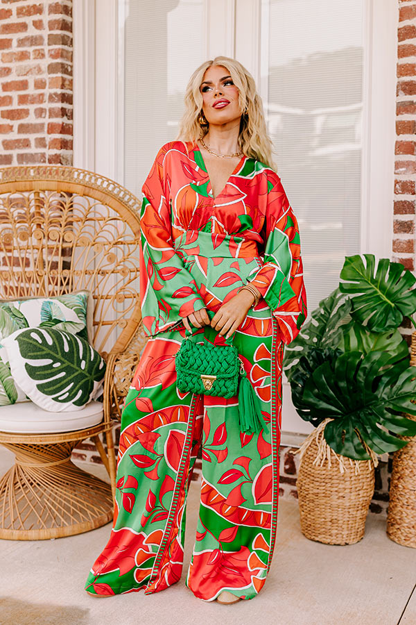 - This stunning jumpsuit is a ticket to sunshine vibes! Featuring a bold vibrant print and a chic satin finish, this trendy wide leg jumpsuit promises to steal the spotlight and keep you feeling fabulous.