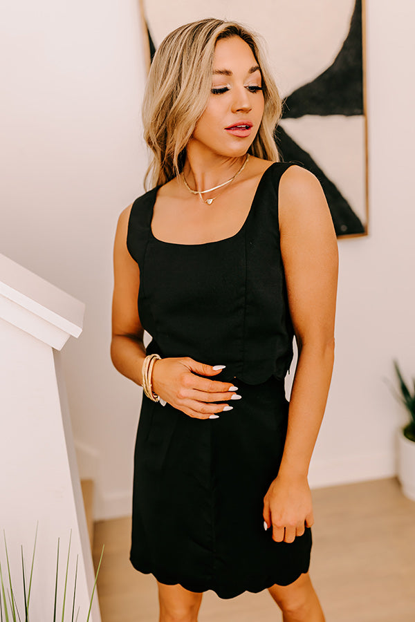 - A figure hugging silhouette that ends in a scalloped, cropped hemline