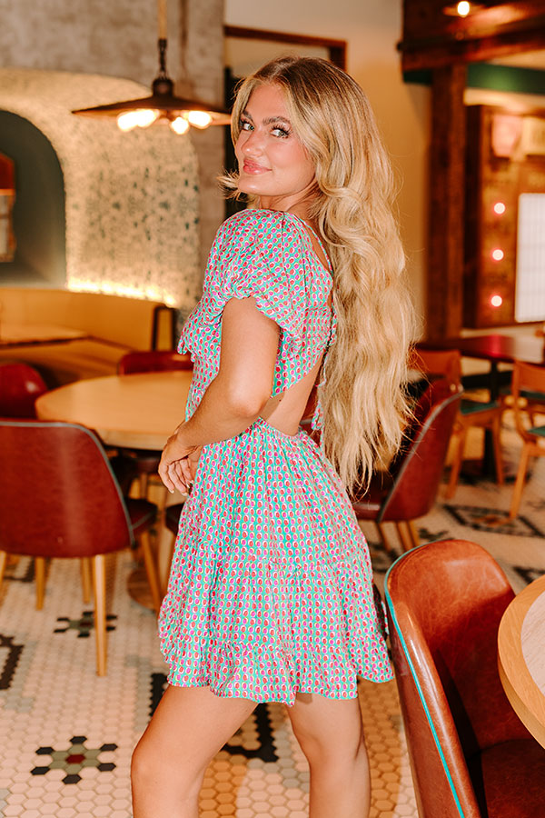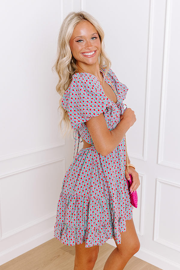 - This dreamy dress is so cute they will have to look twice! - Fully lined material with a pink and purple hued dot pattern - A sweetheart cut neckline with a tie detail - Short puff sleeves with elastic cuffs - A cut out back with lace up detail - A waistline with an elastic back - A flattering silhouette that ends in a mini dress length hemline