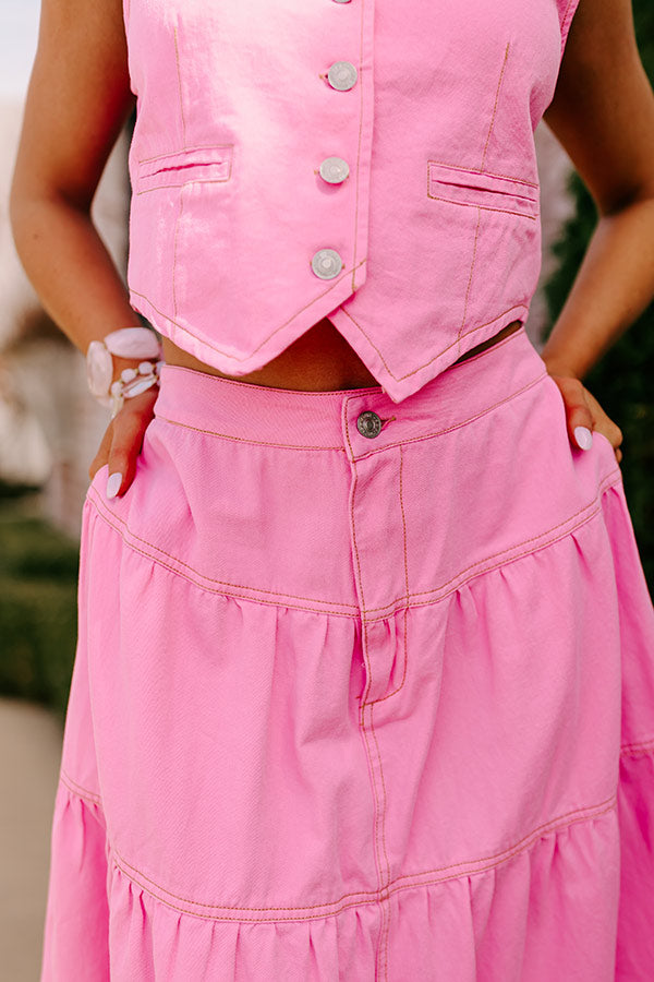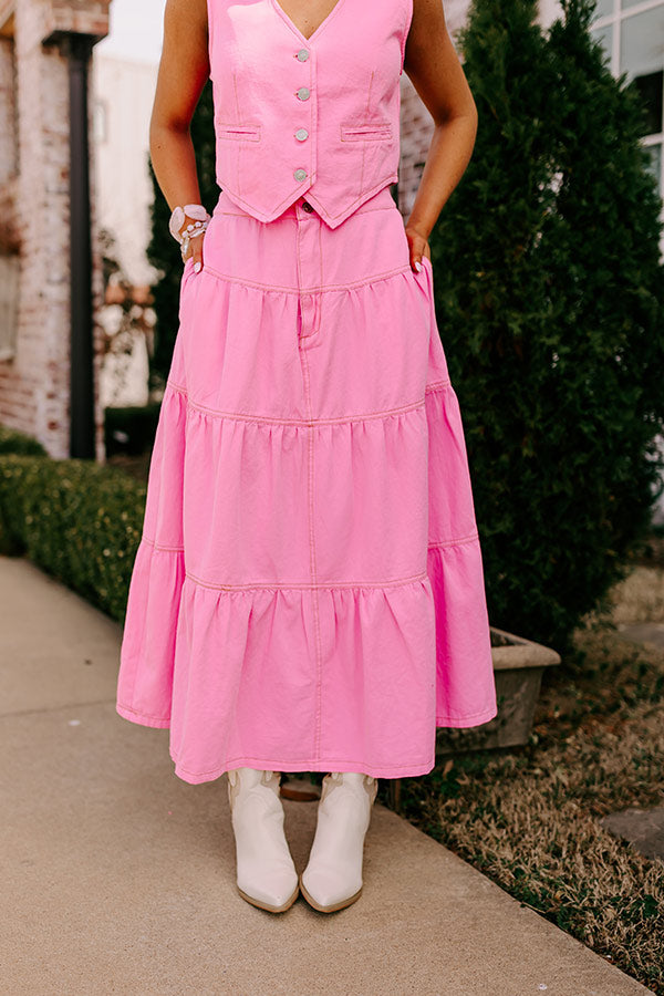 - This adorable skirt is the eye-catching piece you need for your uniquely curated closet! - Unlined non-stretch denim - A waistline with a hidden zip fly and button closure - Functional side pockets - A tiered silhouette that ends in a maxi length hemline