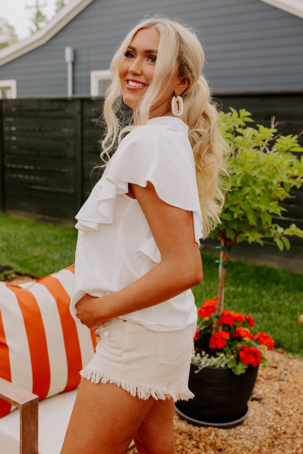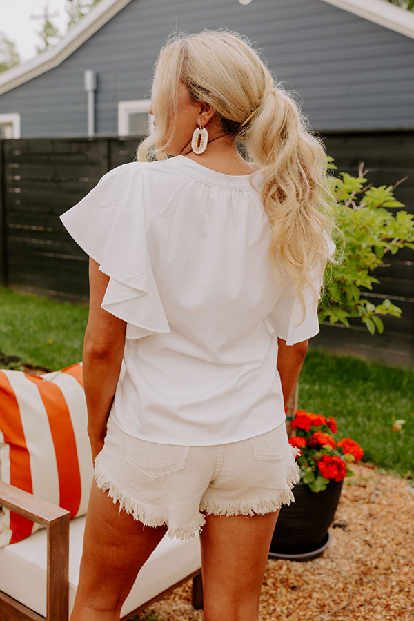 – This beautiful new top will make your heart flutter – Lightweight, soft unlined material with front pleated detail – Deep v-cut neckline with accent button closure – Short flutter sleeves – Relaxed silhouette that ends in a straight hemline