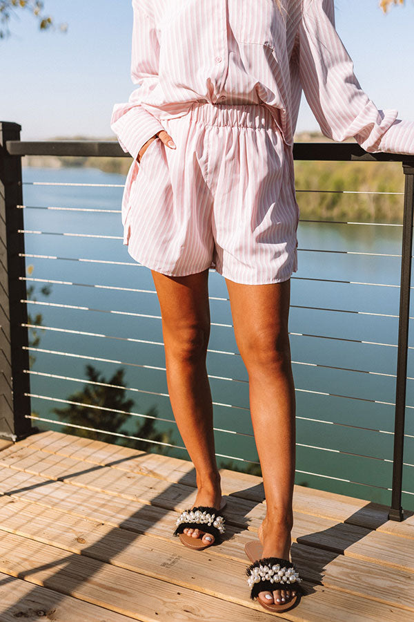 – Enjoy a quiet evening in our trendy shorts – Lightweight, fully lined material in a pink, black and white stripe pattern – Elastic waistband with a faux zip fly detail – Two hidden side pockets – Relaxed silhouette that ends in straight hemlines with accent side slits