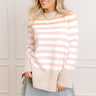 - This sweater is the ultimate mix of cozy and cute! With a sweet striped design and a chic mock neckline, it's perfect for adding a touch of charm to your wardrobe. Stay stylish all season long! - Unlined knit material with a white, iced latte, light pink, and orange hued stripe design - A mock neckline - Long sleeves - A relaxed silhouette that ends in a straight hemline with side slit accents