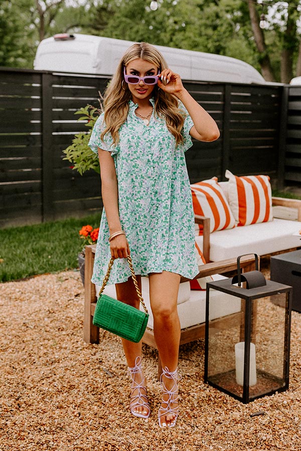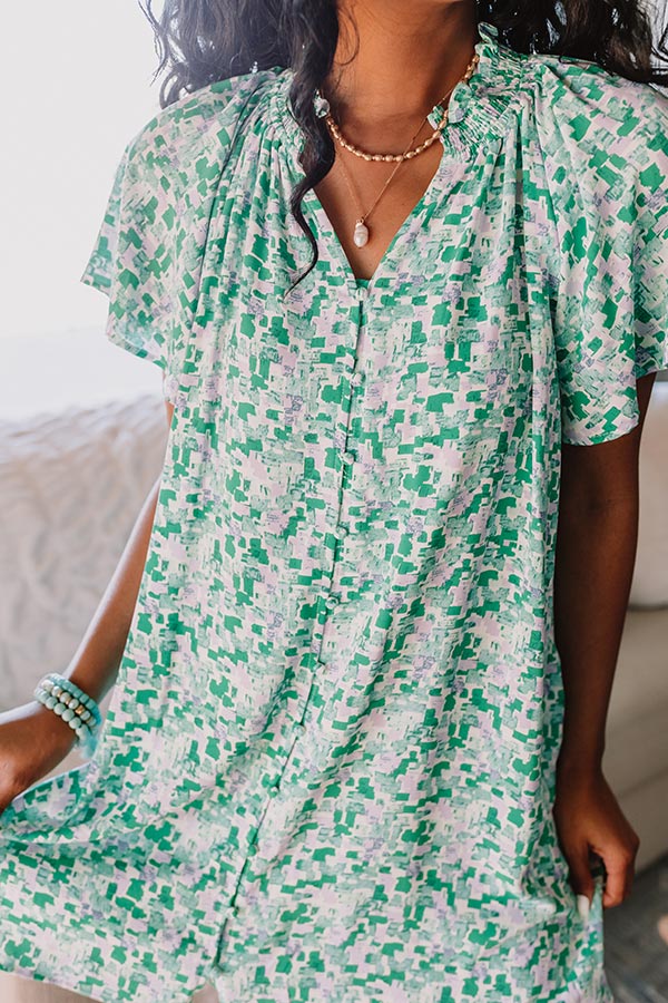 - Twirl into tulip season in this beautiful shift dress! - Lightweight material with a green and purple hued abstract design and a built in full length lining - A v-cut neckline with a smocked neckline with ruffled detail - A button up front - Short unlined sleeves - Hidden side pockets - A relaxed silhouette that ends mid-thigh length