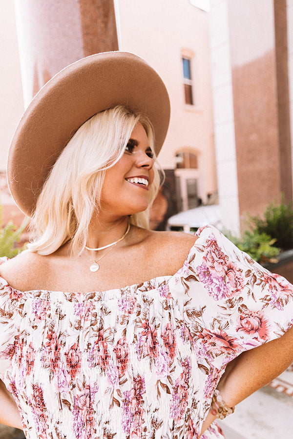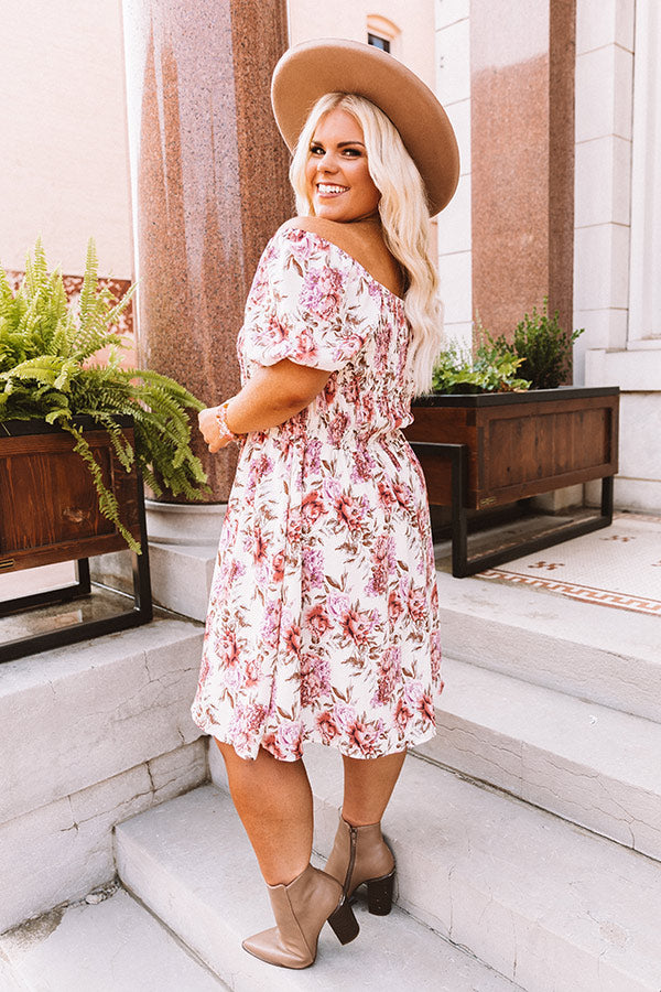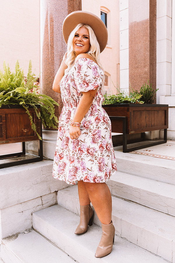 Plus Size - Turn heads in our cute white plus size Unwritten Story dress featuring lightweight material patterned with a pretty pink floral print, a flattering form fitting smocked bodice with a straight neckline, short puff sleeves that can be worn on or off shoulder, and a relaxed skirt silhouette that falls into a straight mid-thigh length hemline!
