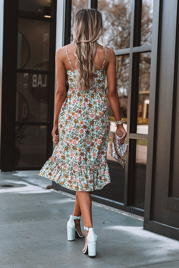 Welcome spring in style with our stunning powder blue "Venetian Glow" midi dress featuring lightweight breezy material patterned with an intricate floral print, a sweetheart neckline with subtle lace trim detailing, a smocked bodice with a tie belt closure, adjustable spaghetti straps, and a relaxed silhouette that falls into an uneven mid-calf length hemline! We have paired this adorable piece with some matching heels, statement earrings, and an embellished clutch, but you can also wear it with "The Alba Wedge in Rust" and our "More Fun In The Sun Hat in Cream!" Measurements