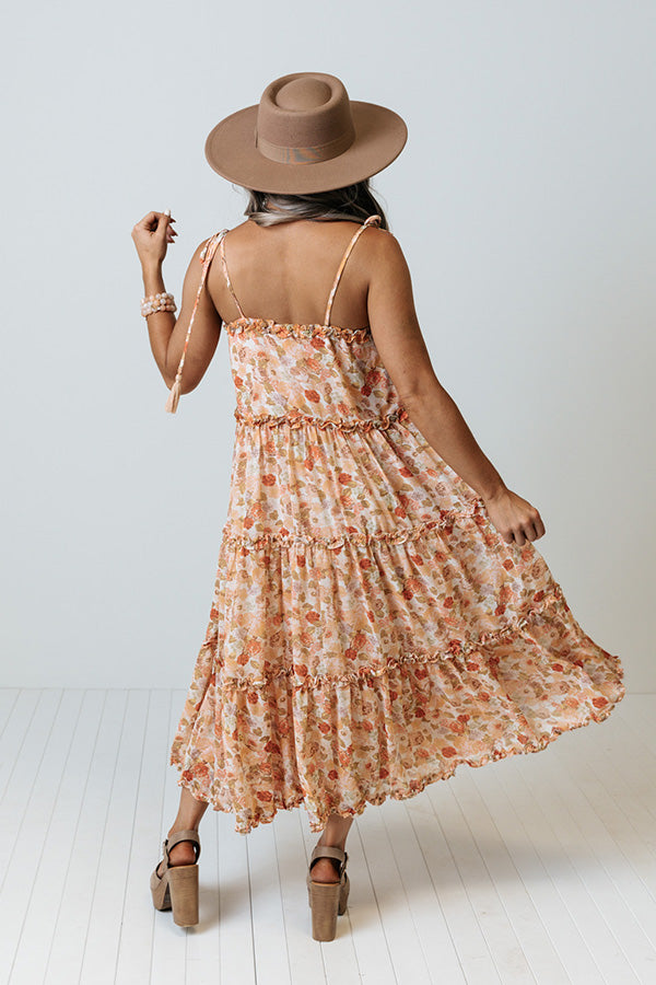 Transition from season to season in effortless style with our pretty 'Vineyard Bound Midi' dress featuring lightweight flowy material patterned with a light peach, olive green, and rust hued floral print, a straight neckline with tie closure spaghetti straps, ruffled exposed accent seams, and a relaxed tiered silhouette that cascades into an uneven mid-calf length hemline! Measurements