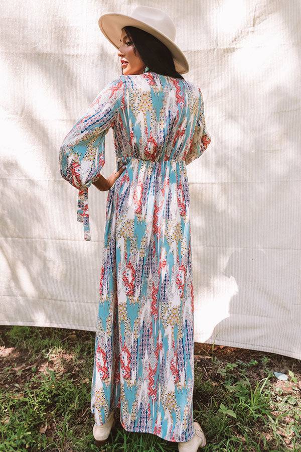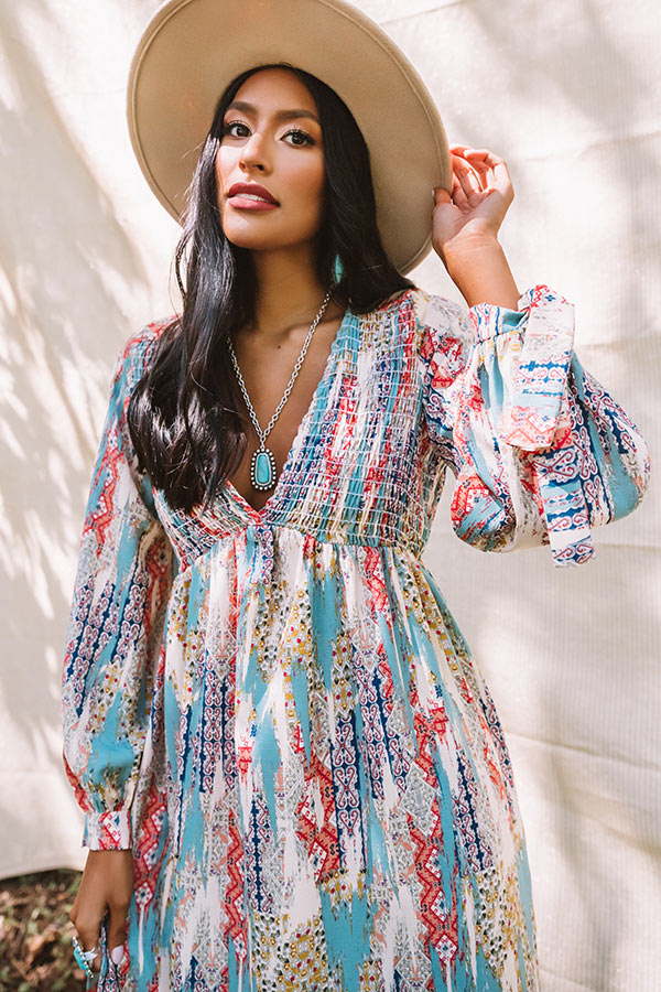 Dress to impress with our stunning "Vineyard Sunset Maxi" dress featuring lightweight breezy material patterned with a beautiful abstract print, a smocked bodice with a v-cut neckline, long bubble sleeves with fitted tie-closure cuffs, and an ultra relaxed silhouette that falls into a straight floor-length hemline! We have styled this head turner with a neutral wedged bootie and wool hat, but you can also wear it with "The Jess Faux Leather Heel in Natural" and our 'Greenwich Village Faux Leather Clutch in Ivory!" Measurements