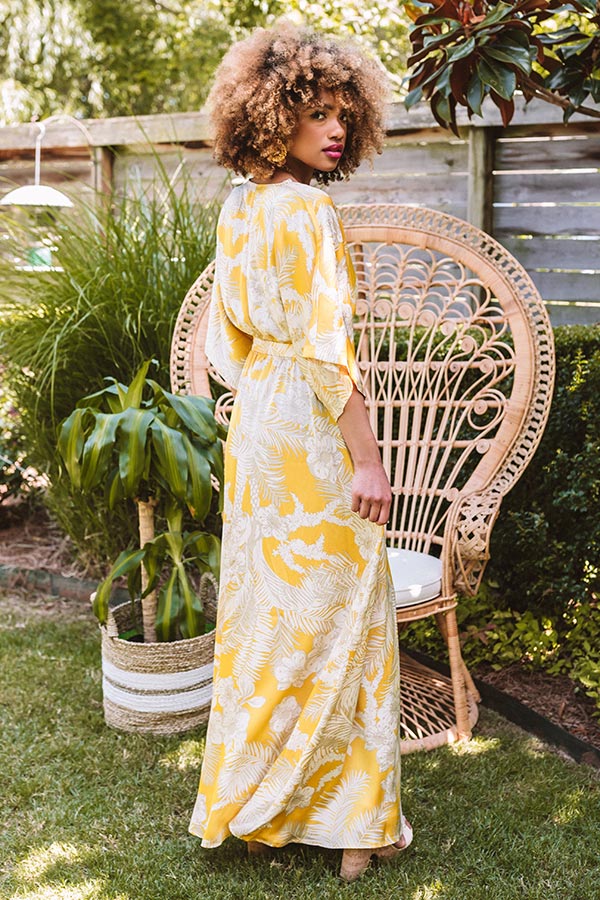 You will surely make waves when you wear this stunning maxi dress featuring sleek lightweight yellow material patterned with a white and neutral hued palm leaf print, a deep v-cut neckline, oversized draped half sleeves, a cinched waistline with a tie belt, and an ultra relaxed skirt silhouette that falls into an uneven floor-length hemline with high side slits! We have styled this beauty with some woven block heels and a chic clutch, but you can also wear it with "The Brighton Espadrille in Yellow" and our "Laying Out In Laguna Woven Hat!"