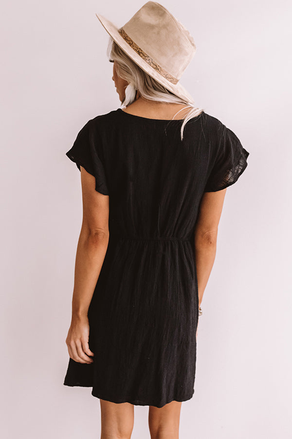 You will be wrapped up in style when you wear this black weekend dress! It features lightweight breezy material, short slouched ruffle sleeves, a wrapped bodice with a v-cut neckline and left side button closure, and a relaxes silhouette that falls into a straight mid-thigh length hemline! This adorable transitional piece styles perfectly with a leopard clutch and a neutral peep toe bootie and faux suede hat, or it can be layered under a distressed denim jacket with "The Delaney Sneaker in Leopard!"
