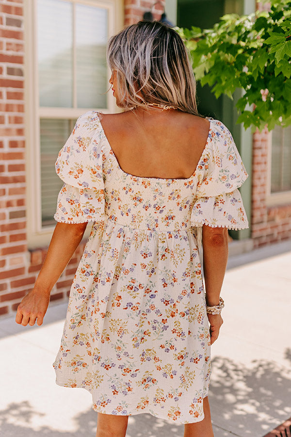 - Whimsical and stylish, this gorgeous dress is a dreamy option for your wardrobe! - Subtly textured material with a colorful floral print - A built-in bust lining - A scoop neckline with ruched detail - Half sleeves with elastic shoulders and elastic ruffle cuffs with crochet trim detail - A smocked back - A flowy yet flattering silhouette that ends in a straight mini dress length