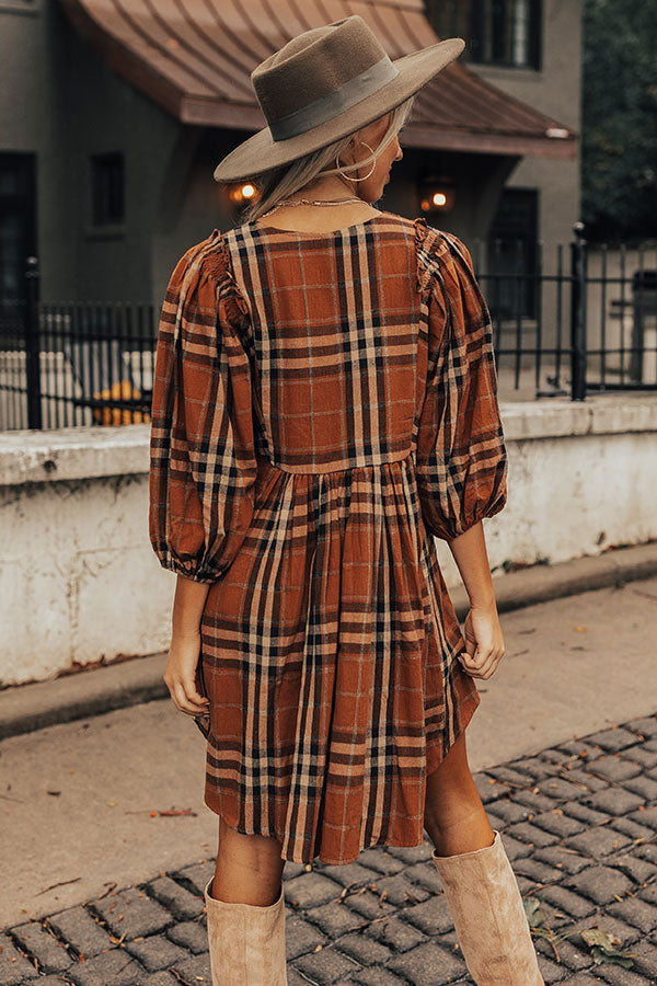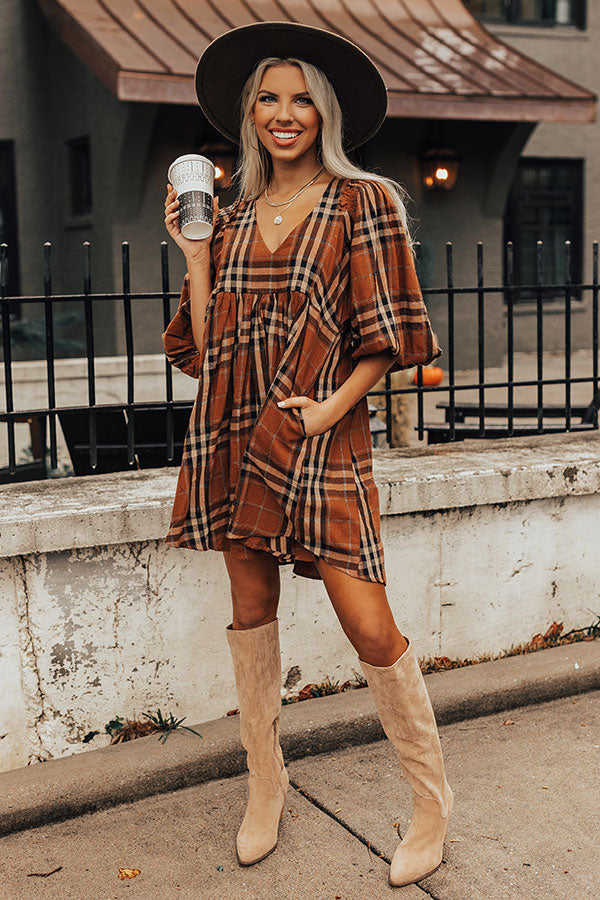 Dress to impress in our darling dark camel colored 'Yearn For More' dress featuring soft lightweight material patterned with a black plaid print, a v-cut neckline, 3/4-length bubble sleeves, hidden side pockets, and a relaxed babydoll silhouette that falls into a straight mid-thigh length hemline! Measurements