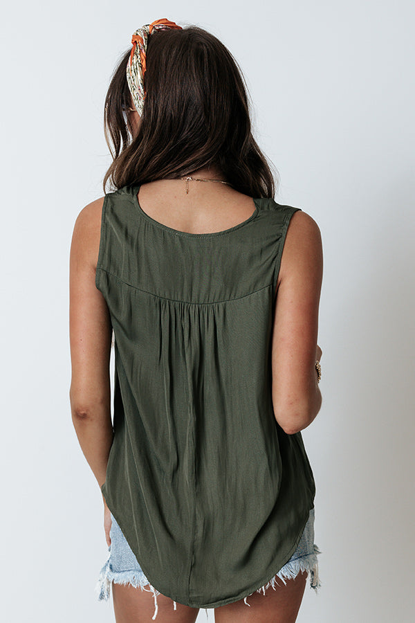 Upgrade your year round basics with our simple but stylish olive colored 'Balcony Kisses Shift Top' featuring lightweight flowy material, a v-cut neckline with wide sleeveless shoulder straps, and a relaxed silhouette that falls into a rounded hemline!