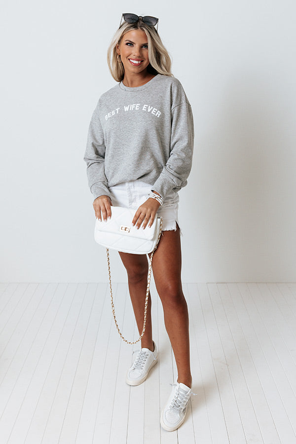 Make a statement in our adorable grey 'Best Wife Ever Sweatshirt' featuring soft lightweight material with cute white block lettering on the front, a rounded neckline, long loose sleeves with fitted cuffs, and a slouched silhouette that ends in a straight hemline! Measurements