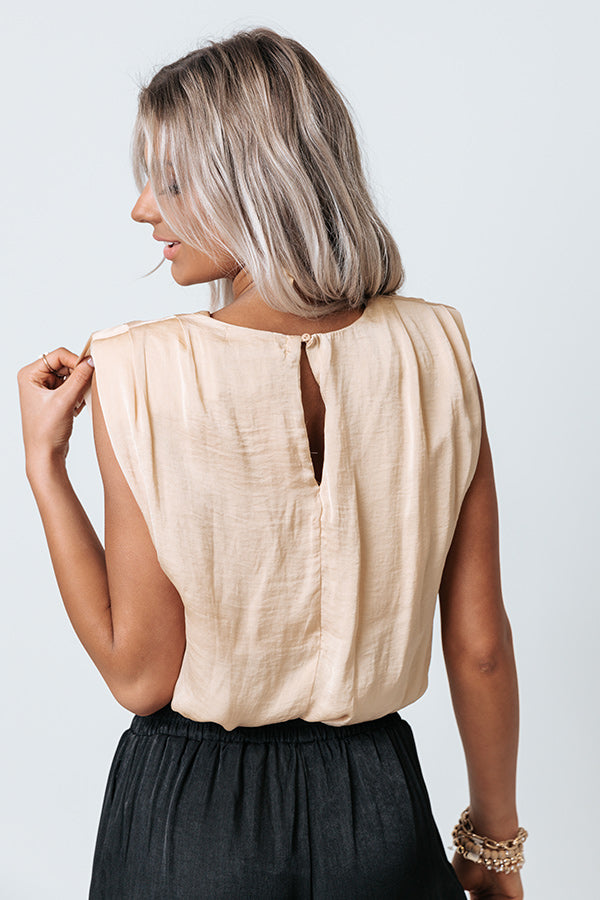 You will look like the ultimate girl boss in our luxe iced latte colored 'Beyond The Berkshires Top' featuring lightweight and flowy satin material, a high rounded neckline, cap sleeves with shoulder pads, a keyhole accented upper back with a button closure, and a slouched but elegant silhouette that falls into a straight tie closure hemline! Measurements