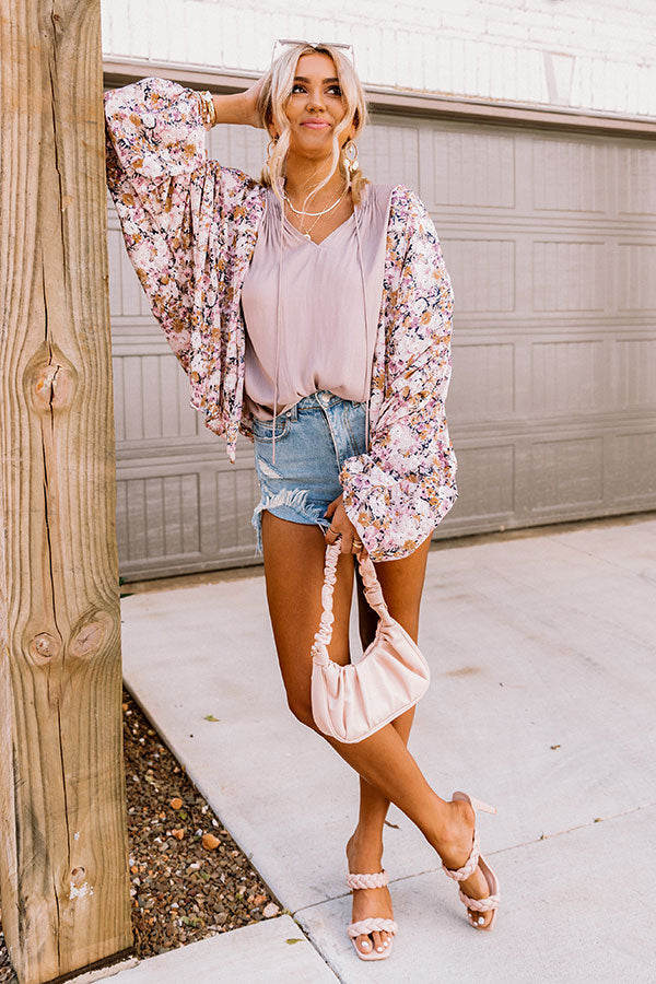 Hey babe! Let your style blossom beautifully with this adorable overlay featuring lightweight breezy material patterned with a heirloom lilac/dusty purple hued floral print, long oversized bubble sleeves, and an ultra draped open front silhouette that falls into a rounded hemline!