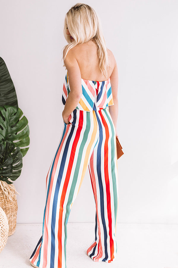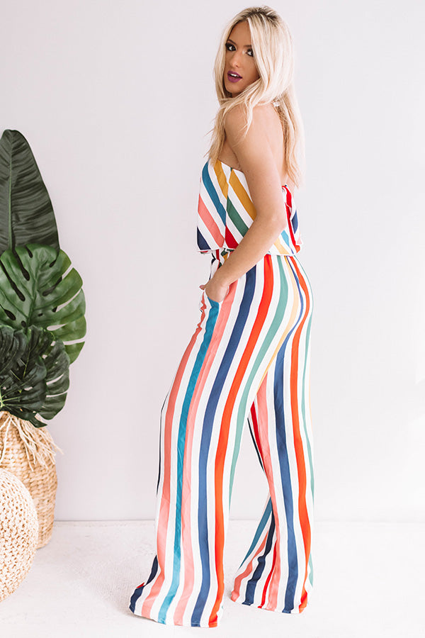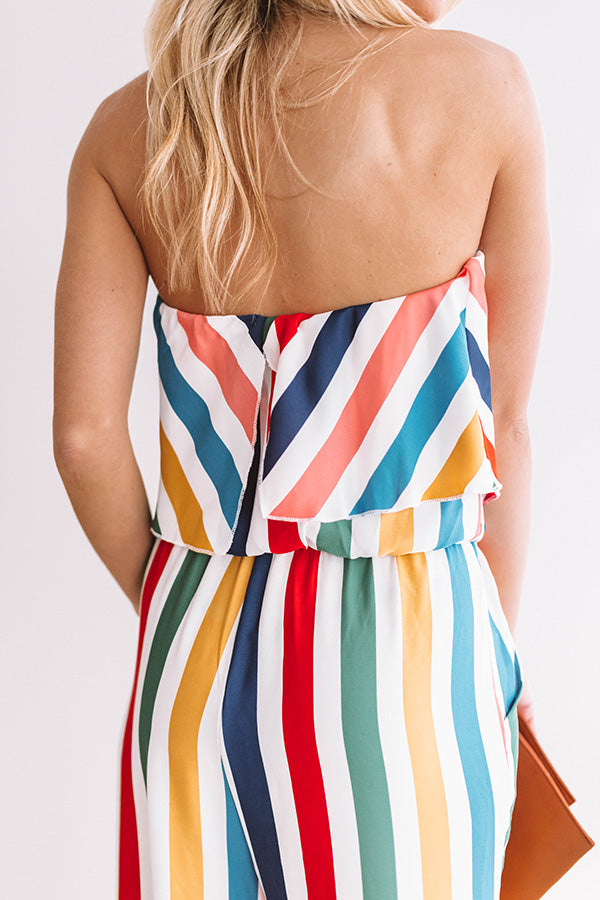 Let your hair down & color outside the lines in our favorite new print of the season! This chic rainbow striped jumpsuit has a flirty flounced strapless bodice, an elastic banded waistline & a relaxed polyester pant with side pockets. Complete your look with a colorful statement earring & your favorite pair of wedges for a wow-worthy look that is full of personality!