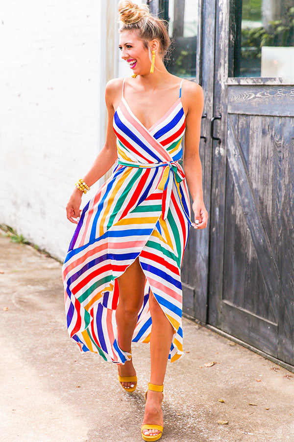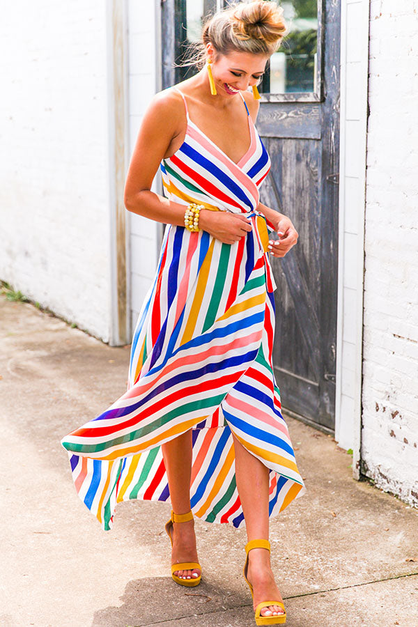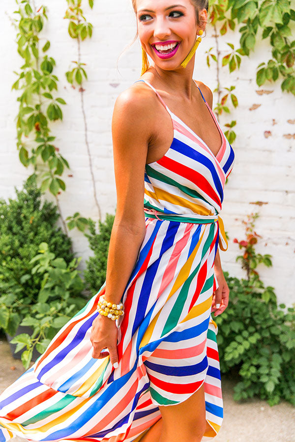 Heat things up in the "Cabo Stripe Maxi Dress!" This stunning striped maxi has thin adjustable straps, a surplice bodice, & an elastic banded sash tie waist that rests atop a gorgeous wrap-style maxi skirt with a tulip hem. Add a colorful statement earring & a sassy block heel & step out in style all Summer long in this must-have multi-color maxi!