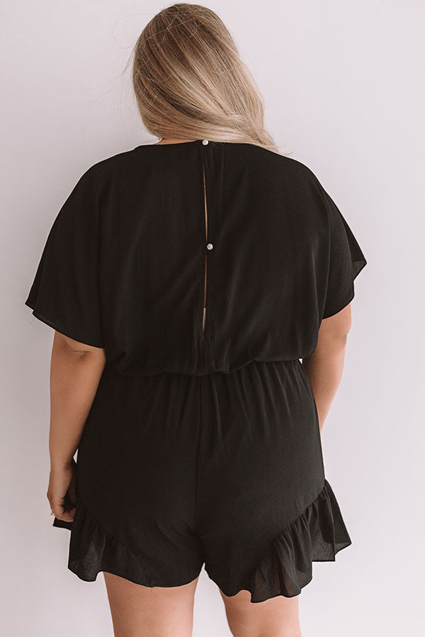 Plus Size - You will absolutely look like a "Cali chick" in this black romper featuring ruffled trim on the shorts, an elastic waistband with a tie belt, loose flowy short sleeves, a v-neck, a subtle ribbed texture, and an open slit back with a two button closure! This flirty and fierce piece can be styled with a pink heel and statement bangle, or you can dress it up even more by wearing it with "The Josie Wrap Up Heel," our "Subtle Shine Beaded Headband," and our "Shimmer In Style Rhinestone Clutch in Silver!"