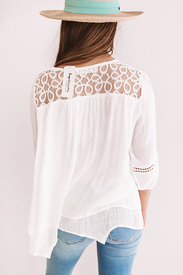 You will be ready for all those "Cape Cod kisses" in this white lace top adorned with 3/4 length breezy sleeves, a v-neck, layered hem, and semi sheer upper back and shoulders! We've paired this piece with flared jeans, but for a better suited warm weather look, style this top with your fave pair of denim shorts, our "The Avery Faux Suede Ruffle Sandal In Blush," and a nude crossbody with our "Garden Party Luxe Scarf" for a sweet summertime look! Measurements