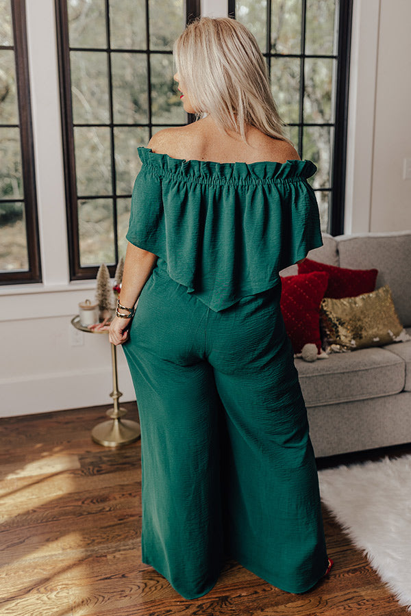 Show up and show out in our striking hunter green plus size 'Celebrating In Times Square Jumpsuit' featuring lightweight material, a straight elastic off-shoulder neckline with ruffled trim detailing and short drop sleeves, a pointed overlay bodice, a cinched waistline, hidden side pockets, and an ultra relaxed pants silhouette that falls straight into ankle-length hemlines! Measurements