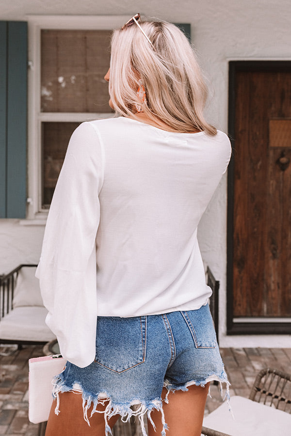 Welcome the fall season in style with our darling white 'Cider Sips Top' featuring lightweight material, a v-cut neckline, a cinched up center front detail with a tie closure, long oversized bishop sleeves with elastic banded cuffs, and a figure flattering silhouette that falls into a draped front hemline and a straight back hem!