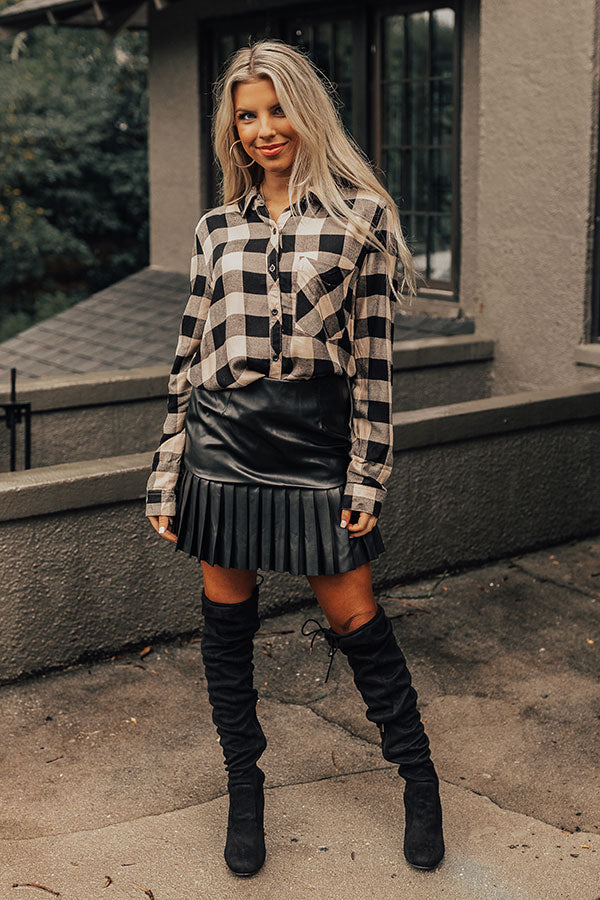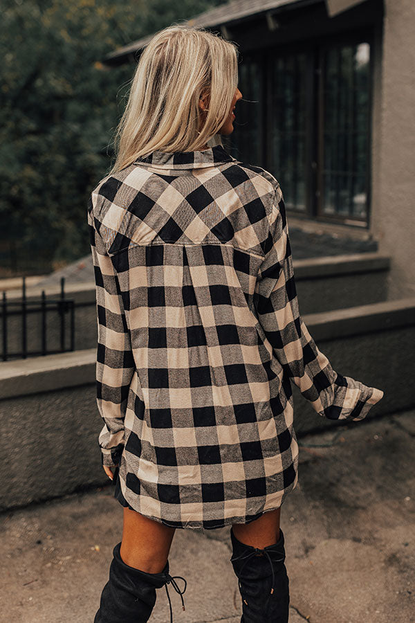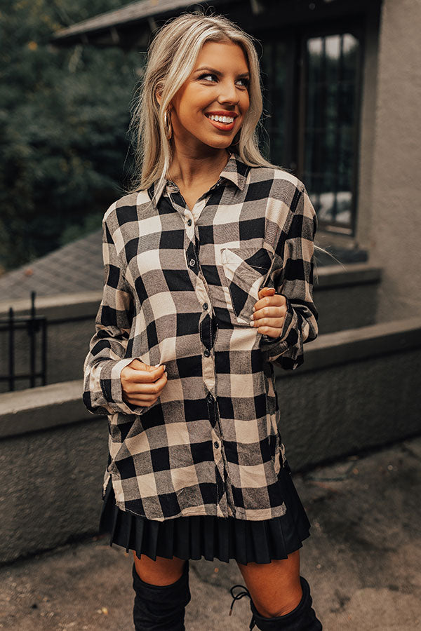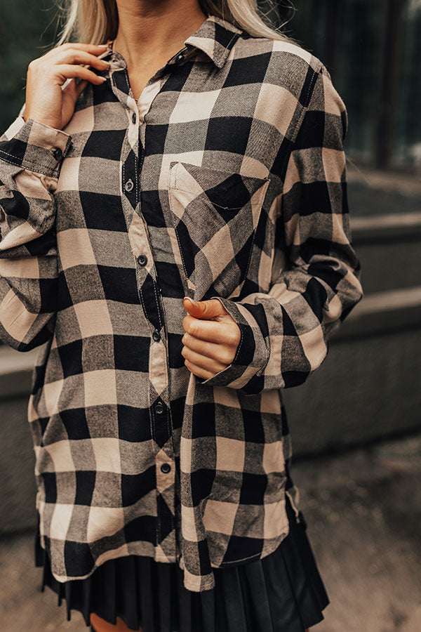 Make all your ambitions come true while looking stylish with this pretty top featuring lightweight material patterned with a black and white plaid print, a button up front with a collared neckline, a single accent chest pocket, long loose sleeves with button closure cuffs, and a relaxed silhouette that falls into a rounded hemline!